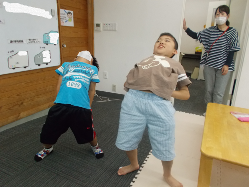 雨が続きなかなか外で体を動かすことが出来ず、体力が余っているときは、ぶーちゃんを使ってラジオ体操を行ってます!
