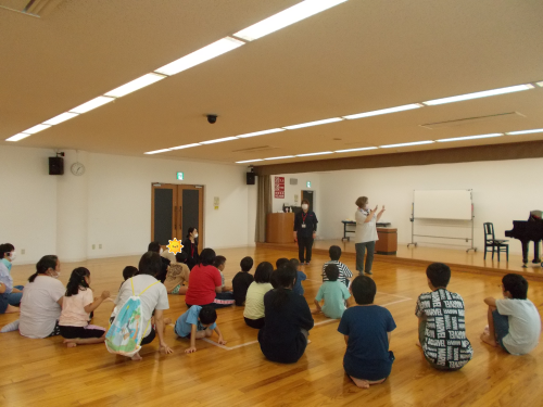 途中、”3びきのこぶた”の手遊び歌が始めると、南校の児童がみんなの前で発表してくれ、西校のみんなで拍手で頑張るお友達を見つめていました。