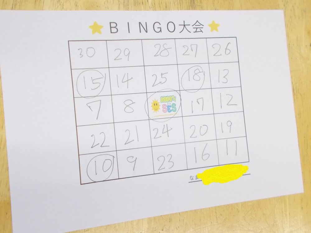 白紙のビンゴ用紙に、1-30までの好きな数字を入れ、